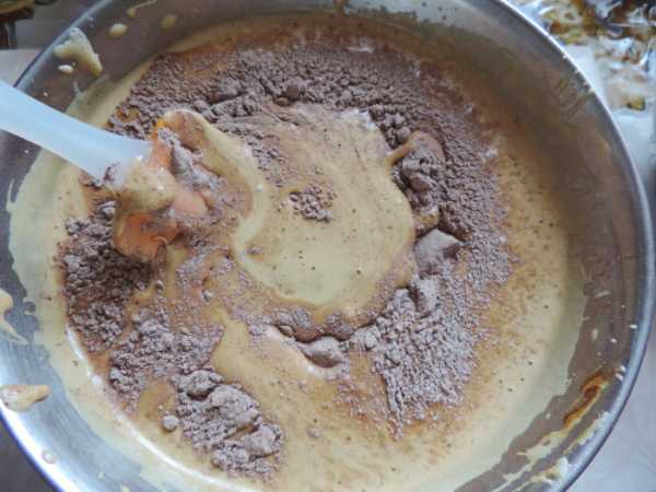 Добавьте муку, смешанную с какао-порошком. Перемешайте быстро (около 15 секунд), чтобы пузырьки воздуха не вышли из теста и не разрушились.