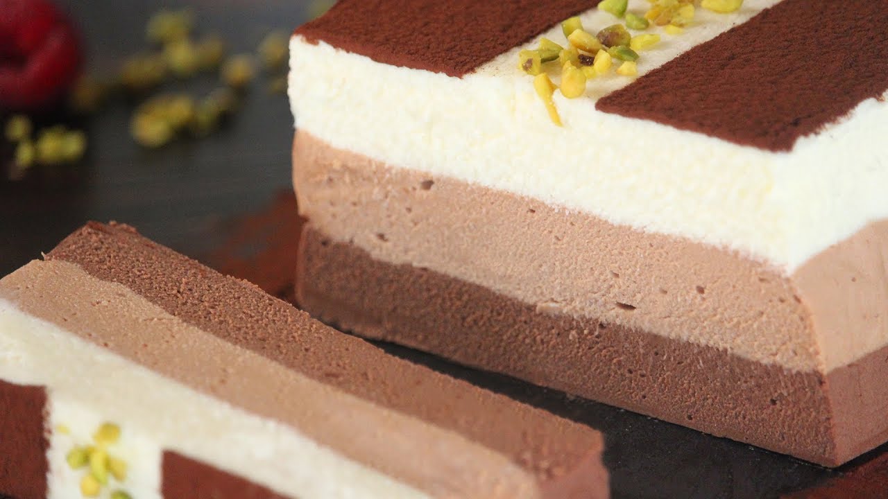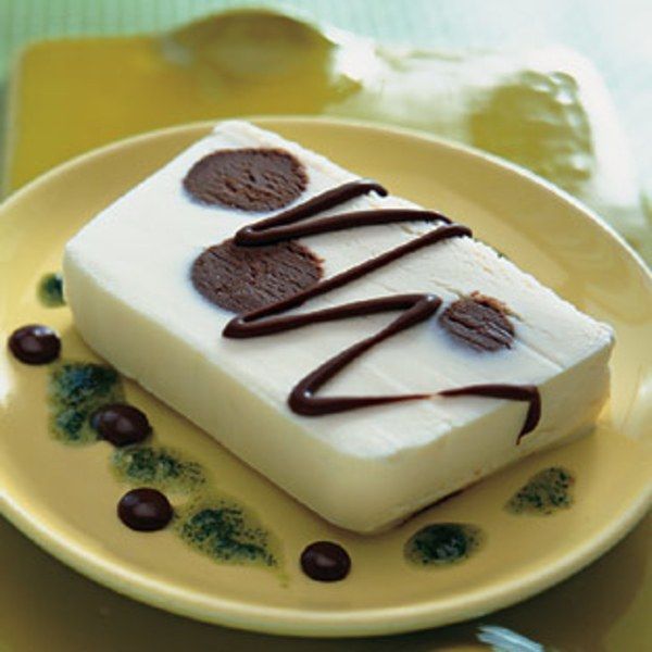 Взбейте около 1 стакана яичных белков, пока они не станут густыми, но не сухими, частично добавив щепотку зубного камня. Добавьте половину сливок и яичные белки в белый шоколад. Таким же образом взбейте вторую чашку яичных белков. Вложите вторую половину сливок и яичные белки в темный шоколад. Вылейте смесь белого шоколада в подготовленную форму. Осторожно выложите сверху смесь темного шоколада. Дайте остыть на ночь.