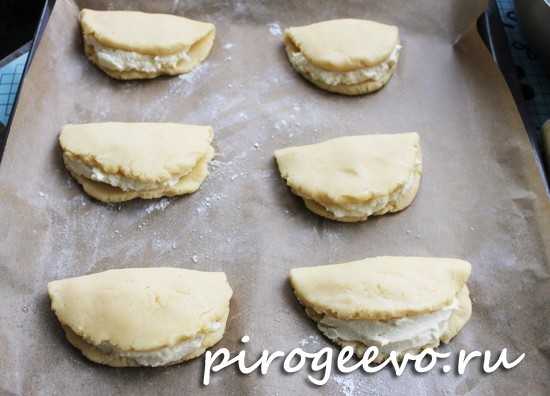 Шаг 8. На каждую половинку выложите начинку (1 ст.л. с горкой). Сверху накройте верхней половинкой теста. Только не защипывайте края. Просто чуть-чуть прижмите их друг к дружке с боков. Сверху смазываем сочники взбитым желтком с молоком.