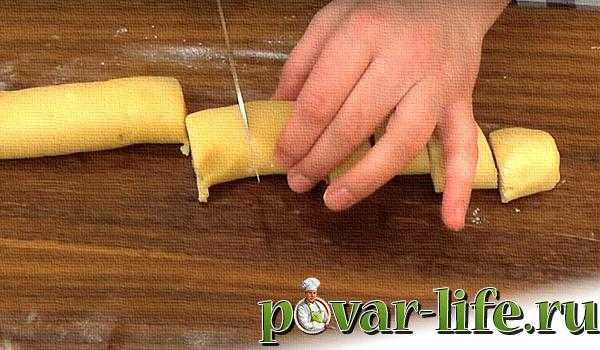 Доску для разделки присыпают мукой. На ней из полученного комка теста раскатывают колбаску, которую делят на 12 равных частей массой 66 г. Каждую часть раскатывают в круг (диаметром от 10 до 12 сантиметров).
