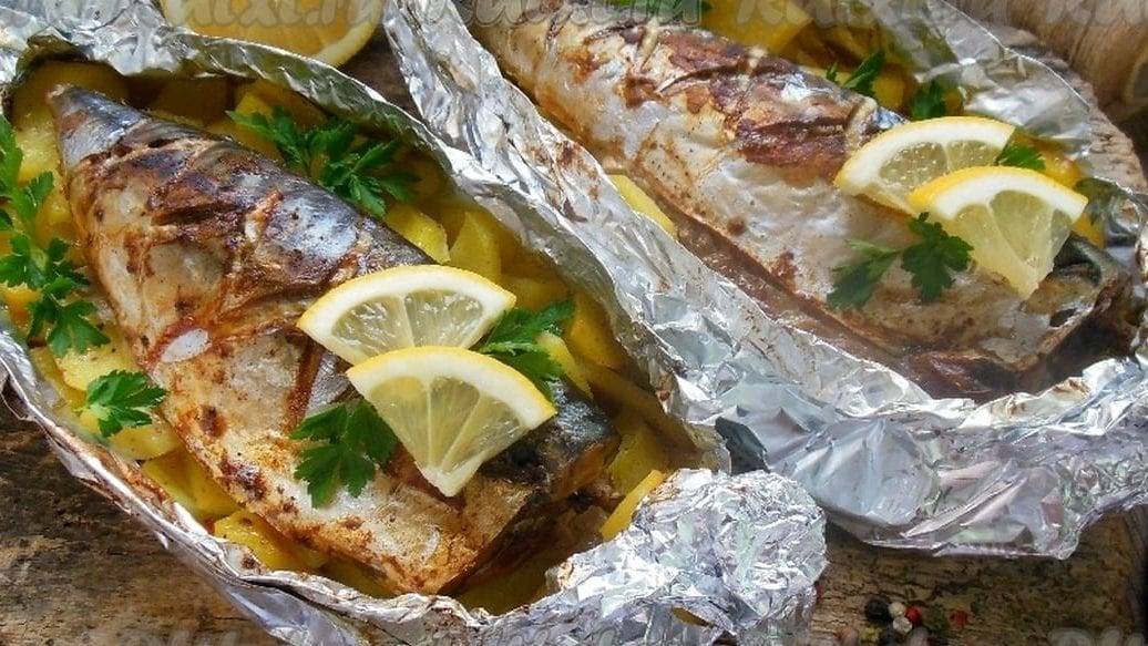 Посолить, поперчить и смазать половиной майонеза (солить следует слегка, так как майонез содержит соль). Морковь натереть на крупной терке. Подготовить 4 листа фольги и смазать их маслом. Выложить на каждый лист картофель, затем сверху рыбу, а после – морковь. Смазать сверху майонезом и аккуратно завернуть края фольги, чтобы получились лодочки с небольшим отверстием по центру. Запекать блюдо в разогретой до 180 градусов духовке в течение 30-40 минут. После этого развернуть края фольги и посыпать блюдо тертым сыром. Запекать еще от 7 до 10 минут до появления золотистой корочки.