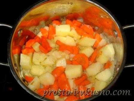 В масле прогреваем кубики лука и чеснок. Не поджариваем, зажарку мы делать не будем. Добавляем морковь, помешивая тушим овощи 2-3 минуты.