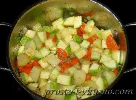 - Сельдерей хорошо очищаем и нарезаем кубиком вместе с цукини. Припустить их до готовности в небольшом количестве воды.