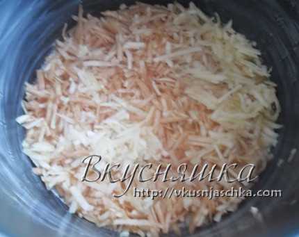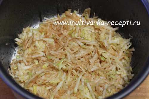 В смазанную маслом чашу выкладывать слоями: слой сухой смеси, слой тертых яблок.