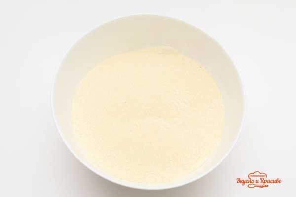 В глубокой чашке смешаем сыпучие ингредиенты: муку, сахар, ванильный сахар, манку, соль.