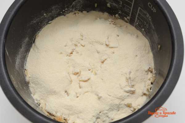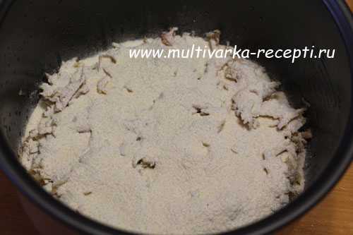 На дно мультиварки высыпаем 1 / 4 часть » сухого» теста.