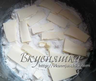 Будущий пирог «затираем» стылым сливочным маслом. Масло можно просто порезать, а можно потереть на терке, разницы нет.