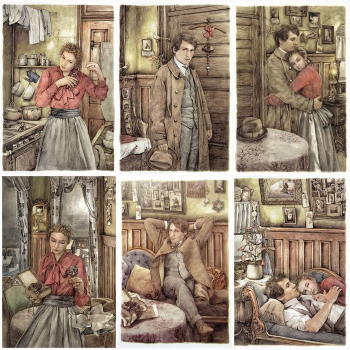 У этой раковины Хетти увидела девушку с густыми темно-золотистыми волосами и жалобным выражением глаз, которая мыла под краном две большие ирландские картофелины. Мало кто знал «Валламброзу» так хорошо, как Хетти. Кимоно были ее энциклопедией, ее справочником, ее агентурным бюро, где она черпала сведения о всех прибывающих и выбывающих. От одного розового кимоно с зеленой каймой она давно узнала, что девушка с двумя картофелинами — художница, рисует миниатюры, а живет под самой крышей в мансарде, или, как принято выражаться, в студии. Хетти не очень точно знала, что такое миниатюра, но была уверена, что это не дом, потому что маляры, хоть и носят забрызганные краской комбинезоны и на улице всегда норовят заехать своей лестницей вам в лицо, у себя дома, как известно, поглощают огромное количество пищи.![]()