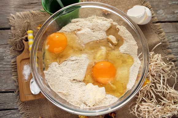 - в глубокой миске как следует смешивают между собой 2 куриных яйца, 1,5 стакана пшеничной муки и 4 больших ложки толокна;