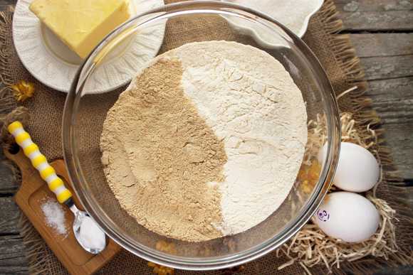 Сливочное масло заблаговременно выньте из холодильника, чтобы оно размягчилось. В большую миску просейте толокно и пшеничную муку.