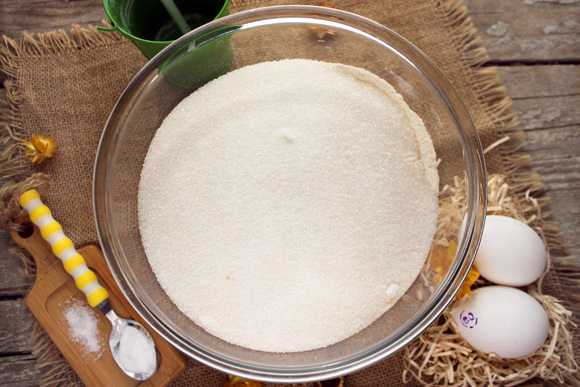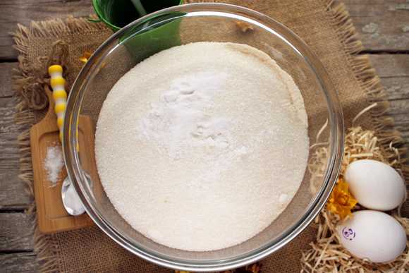 - 2 свежих куриных яйца разбивают в миску или кастрюлю, добавляют к ним 1/3 стакана сахара и как следует взбивают.