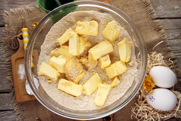 Перемешайте сухие ингредиенты. Добавьте кусочки размягчённого масла. Перемешайте.