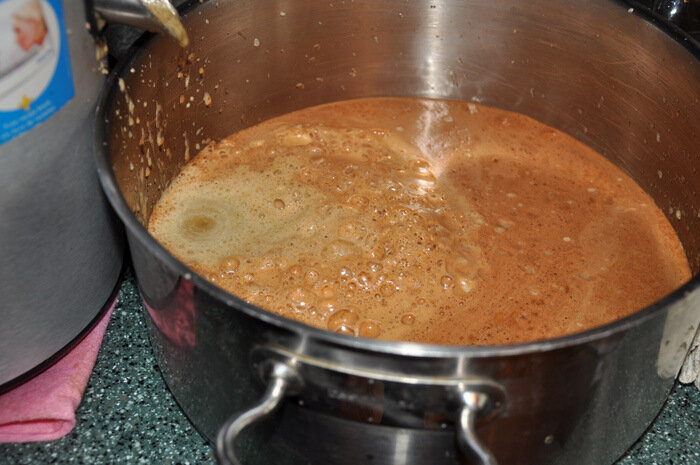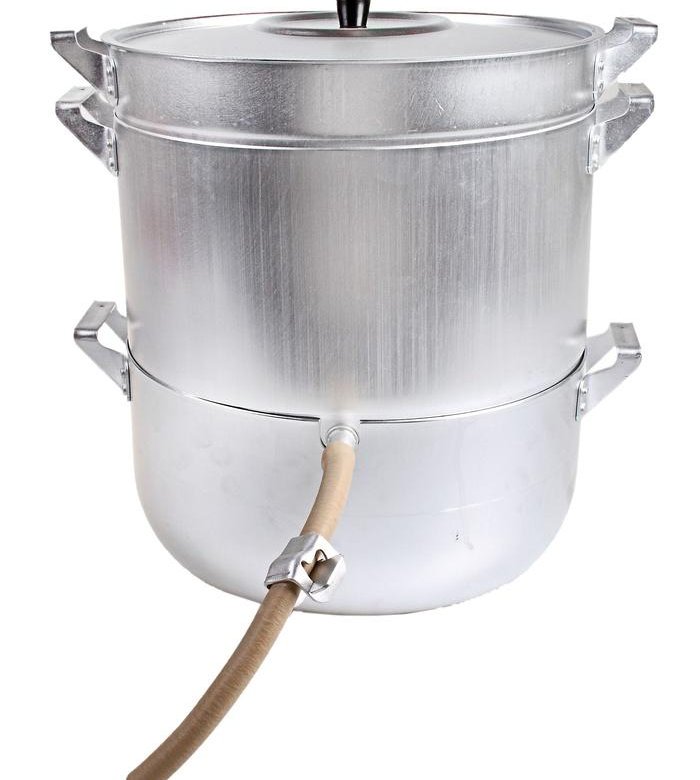 Поэтому после дробления их нужно поместить в эмалированную кастрюлю, добавить воды – 1 литр на 8 килограмм раздавленных плодов, и нагревать до температуры 60 градусов.