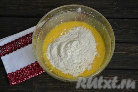 - Просев муку, всыпайте ее в смесь по частям. Важно получить смесь нужной консистенции, которая будет походить на нежирную сметану.