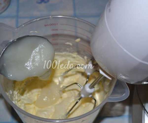 Пока бисквит остывает, взбиваем масло до белизны и пышности и, постоянно взбивая, понемногу добавляем молочно-крахмальный сироп.