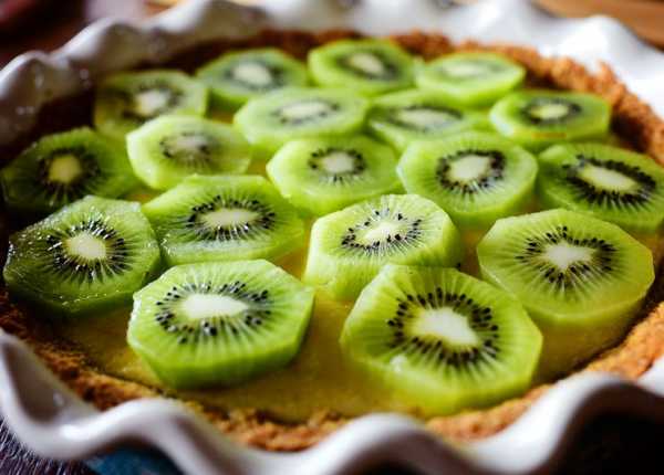 - Дно подходящей формы необходимо застелить пекарской бумагой и выложить в нее получившееся тесто. Его необходимо разровнять, сформировав бортики, и поверху разложить очищенные от кожицы и красивыми дольками и кружочками резанные плоды киви.