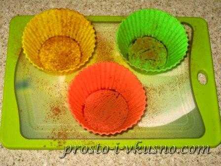 Формочки для кексов смазываем сливочным или растительным маслом и через мелкое ситечко присыпаем порошком какао или мукой.