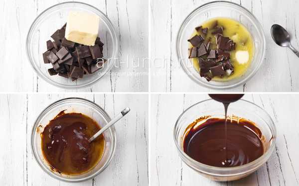 - Сначала необходимо растопить шоколад вместе с маслом. Сделать это можно на водяной бане, в микроволновке или в духовой печи. Для того чтобы растопить их на водяной бане, нужно поставить блюдо с кусочками плитки на кастрюлю с кипящей водой так, чтобы его дно не касалось поверхности кипятка. Все время, пока смесь не растворится, необходимо ее помешивать. Чтобы растопить масло и шоколад в микроволновке, нужно поставить миску с ними в печь и выставить самый низкий температурный режим. Так нужно включать ее интервалами по 30 секунд, а между ними перемешивать смесь, пока она не растает. Для того чтобы кусочки шоколада и масло растопились в духовке, емкость с ними нужно поставить в нее на 5-10 минут и выставить самую маленькую температуру. После достать и все перемешать.