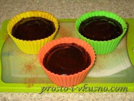 - Тесто перемешиваю и разливаю по формам. Выпекаю 10 минут при 160 гр. в духовке. Внутри он будет сырым, а сверху десерт покроется корочкой, на которой появиться небольшая трещинка.