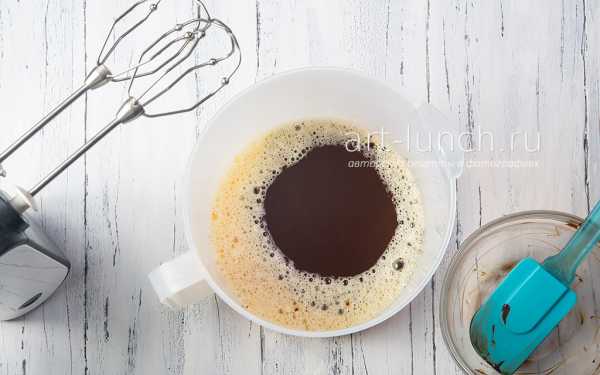 Выливаем остывшую шоколадную массу в яичную и перемешиваем. Обязательно проследите за тем, чтобы шоколадно-масляная смесь не была очень горячей, иначе яйца могут свернуться.