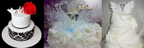 Пара белых лебедей или голубков – атрибут чистой любви и верности – популярный у молодоженов декор свадебного угощения. Для таких изделий используется белоснежная мастика. Эффектно смотрятся птицы, у которых воспроизведена фактура пера. Фигурки-символы не принято есть – по традиции жених с невестой должны сохранить их на память. Также популярны фарфоровые или стеклянные птицы, которые, украсив свадебный торт, впоследствии станут частью домашнего интерьера.