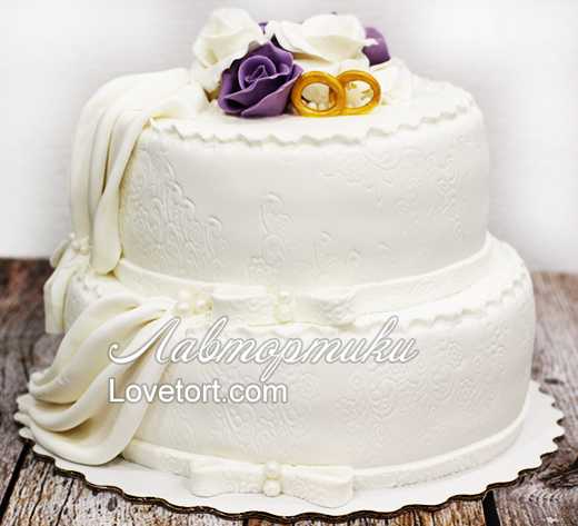Поверхность торта украшена элегантным букетом. Белые и лавандовые розы гармонично дополняют декорации, добавляя ярких оттенков в свадебный торт с кольцами. Каждый лепесток выполнен идеально: будто живой, распустился на розе, приоткрывая нежнейший бутон.
