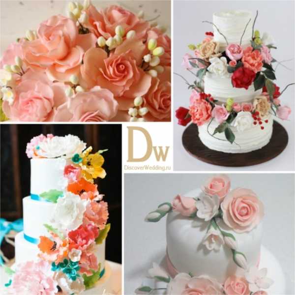 Не меньшей популярностью пользуется свадебный торт с цветами из мастики. Розы, лилии, орхидеи, ромашки — любой цветок можно вылепить из мастичной массы. Можно украсить ярус полностью цветами, а можно сделать только одну веточку. Вариантов масса. Некоторые торты украшаются живыми цветами. Цветы можно напечатать специальной техникой печати на рисовой съедобной бумаге, которой оборачивают коржи. На эту бумагу можно нанести изображение молодожёнов.