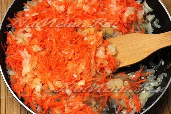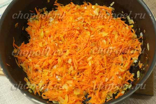 К тушеному луку добавляем морковь. Прогреваем 3-5 минут до того момента пока морковь не впитает масло. Поджаривать ее тоже не нужно, морковь лишь слегка размягчаем, чтобы она потеряла объем и пропиталась ароматным маслом.