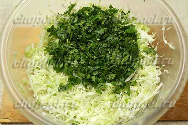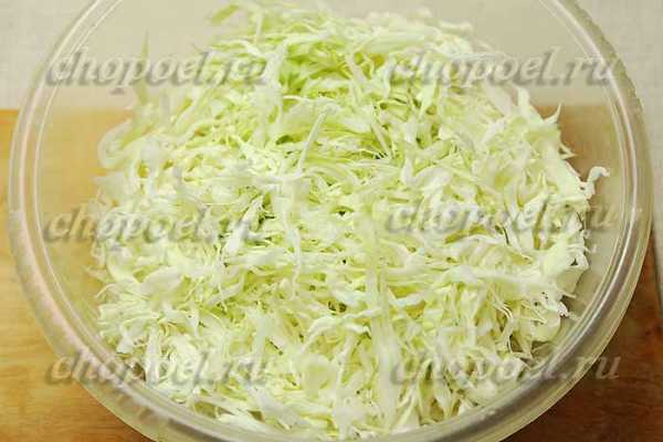 Мелко шинкуем капусту и слегка перетираем ее руками (соль не добавлять!).