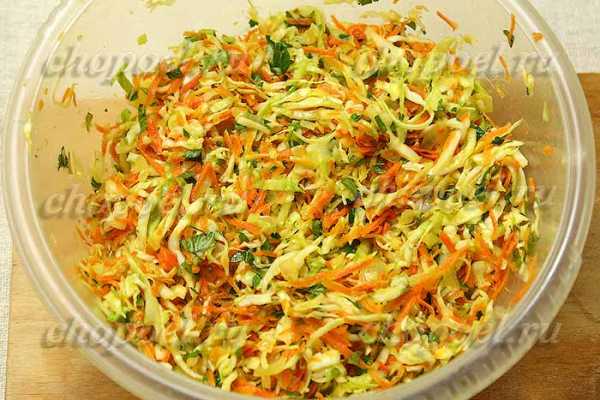 - Капусту шинкуют, но не слишком мелко, а морковку трут на крупной терке, после чего их смешивают в глубокой эмалированной посуде.