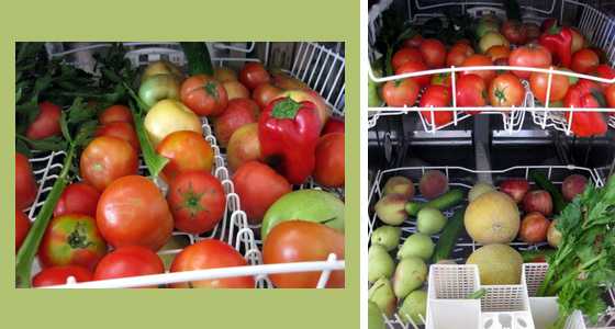 Овощи и фрукты. Затеяли консервацию? Скоро должны прийти гости? Если вам нужно перемыть кучу картошки, перца, помидор, яблок и других продуктов, распределите их на полках посудомоечной машины. Запустите режим ополаскивания холодной водой без использования моющих средств.