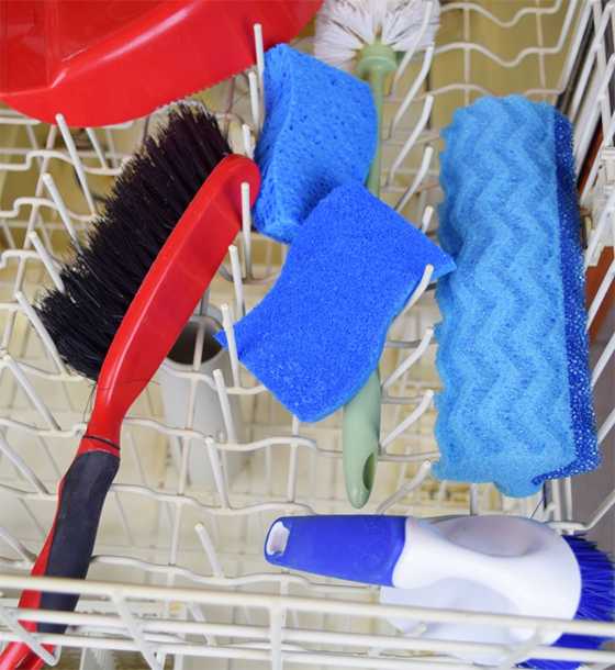 Предметы для уборки. Щетки, губки, мочалки пройдут дезинфекцию при высокой температуре.