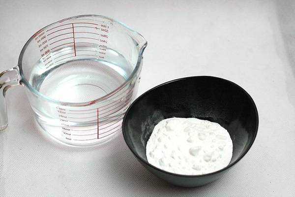 В глубокую емкость налейте два литра теплой воды. Добавьте ложку уксуса и столько же соды. Произойдет реакция между компонентами. Как только появятся пузырьки, смесь перелейте в форму для выпекания. Подождите одну минуту.