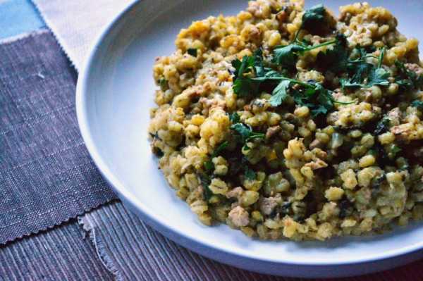 Ингредиенты: 2 мультичаши перловой крупы, 5 — фильтрованной воды, стандартная банка тушеной свинины или говядины, средняя луковка, мелкая соль, морковка, ароматные травки.