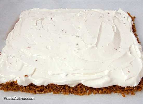 - Сверху на коричневый слой выкладываем взбитые белки. Лопаточкой выравниваем, чтобы слой воздушной пены получился одинаковой толщины.