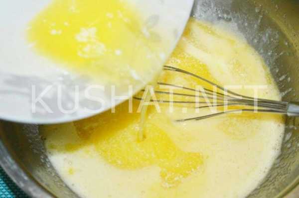 Сливочное масло подтопим в сковороде или микроволновой печи, остудим, добавим в смесь муки с сахаром.