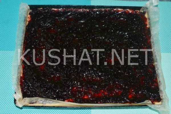 - Теперь берём противень с основой и намазываем на корж повидло. Песочный пирог с безе вкуснее получится, если повидло у вас с кислинкой. И можно не жадничать, как я. Погуще можно, вот что я хотела сказать.
