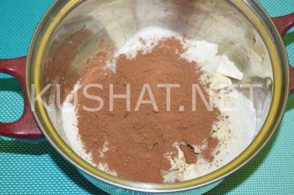 Всыпьте сахар и порошок черного какао. Перемешайте все ингредиенты.