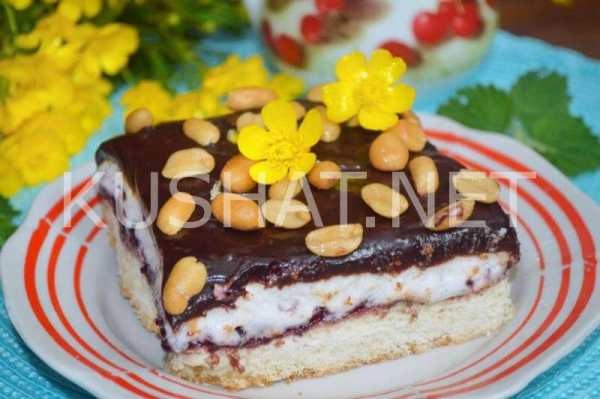 Готовую шоколадную помадку слегка остудите. Когда она станет теплой (около 40-50 градусов), покройте ею пирог с безе. Готовый песочный пирог с безе, вареньем и шоколадом посыпьте поджаренным на сухой сковороде арахисом. Можно заменить его при необходимости грецкими орехами или кокосовой стружкой.