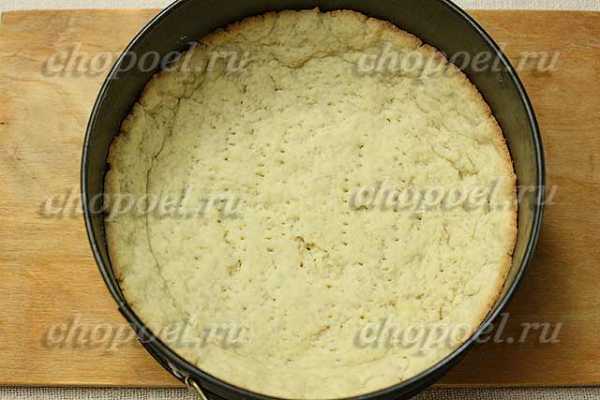 - Круглую форму для выпечки застилаем бумагой для выпечки. Раскатываем тесто, выкладываем в формочку, сформировав бортики, часто колем вилкой. Сверху выкладываем еще один лист пергамента, насыпаем фасоль или сухой горох, чтобы зафиксировать бортики. Запекаем четверть часа при 220 Со. Потом убираем бобовые и допекаем ещё 10 минут. После, печеность достаем и полностью остужаем.