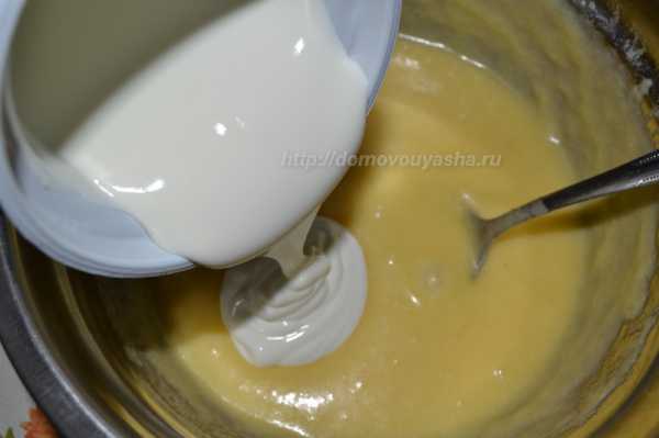 Все хорошо перемешиваем, добавляем с начало пол стакана муки и 2 чайные ложки разрыхлителя теста.
