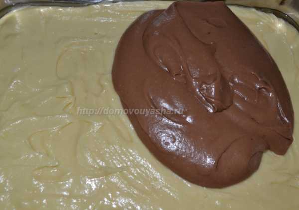 Далее берем форму прямоугольной формы, немного смазываем его растительным маслом со всех сторон. Далее распределяем по форме белое тесто, а сверху нужно распределить шоколадное тесто.
