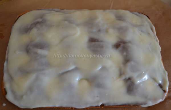 Вынимаем форму из духовки и даем остыть. Смазываем кремом поверхность пляцока и присыпаем какао-порошком.