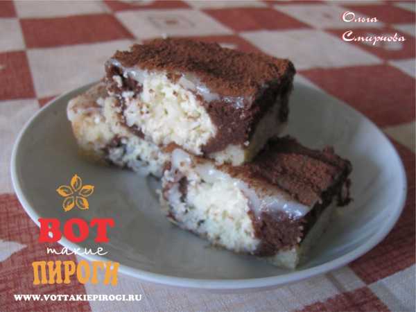 Размягченный маргарин комнатной температуры взбиваем с сахаром, вводим по одному яйца и белок, продолжая взбивать, добавляем сметану и молоко. Затем вводим разрыхитель и муку. Прямоугольную форму смазываем маслом и присыпаем мукой. Выливаем половину теста, а в остальную добавляем какао и вторым слоем выливаем и распределяем поверх белого теста. Далее, берём подмороженные кокосовые шарики и выкладываем сверху, чуть придавливая. Отправляем пляцок в духовку на 40 минут при температуре 180-200 градусов.