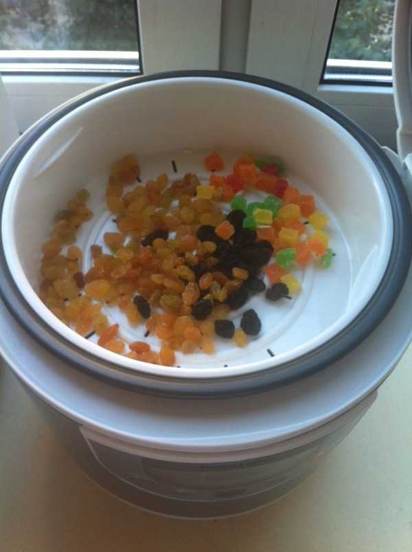 Чтобы разнообразить блюдо, в лоток для готовки на пару всыпал немного изюма и цукатов. Поставил сверху: