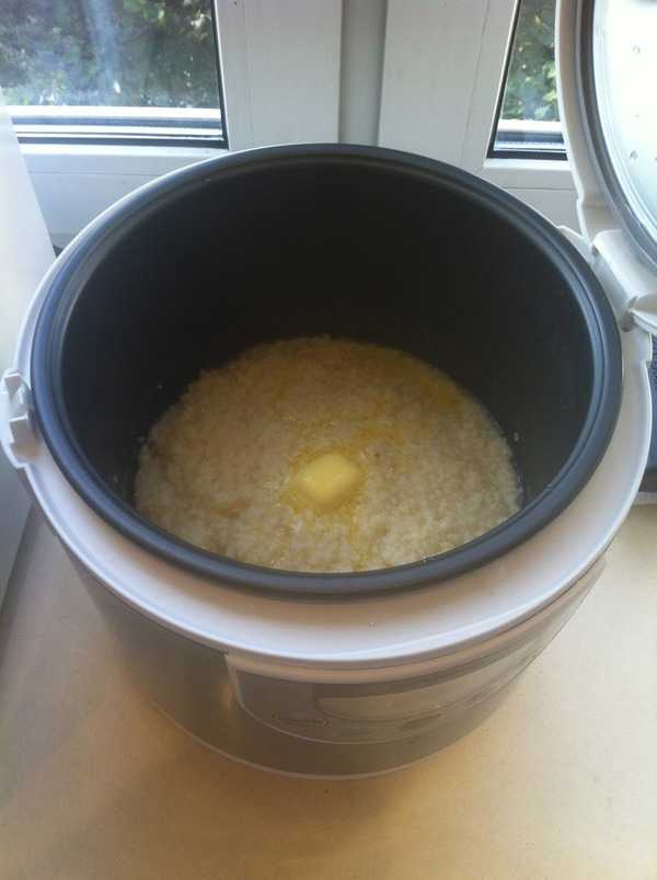 Дожидаемся звукового сигнала о завершении процесса приготовления. Открываем крышку и добавляем сливочное масло, оставив на режиме «Подогрев» еще на 5 минут. После чего выключаем мультиварку.