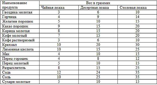 В рецептах необходимое количество твердых продуктов обычно пишут в граммах, но некоторые из них можно измерять ложками, стаканами и банками. Для удобства можно воспользоваться следующей таблицей мер и весов продуктов в граммах.