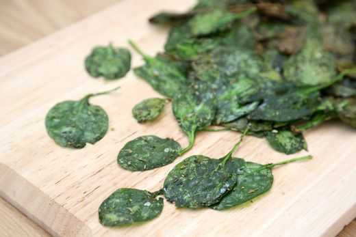 Диетические чипсы — это не фантастика, а вполне реальная и весьма интересная закуска. Попробуйте овощные чипсы без масла из шпината и убедитесь в этом сами. Промываем под водой 200 г шпината, разделяем его на листики и высушиваем. Равномерно раскладываем их на противне с плотной пергаментной бумагой. Посыпаем шпинат солью, перцем с сушеным базиликом и отправляем его в разогретую до 180 °C духовку на 7–8 минут. Даем чипсам как следует остыть и только потом отделяем их от пергамента. Диетические овощные чипсы из шпината приятно разнообразят меню тех, кто придирчиво следит за правильным питанием. Порция такой закуски пополнит запасы железа в организме, поднимет его тонус, а заодно укрепит сердце и сосуды.