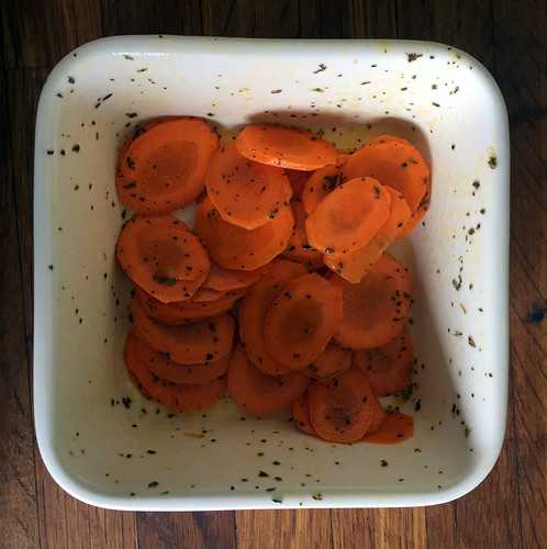 - Нарезала пластинами толщиной чуть меньше сантиметра, залила маринадом, добавила тимьяна, перемешала, оставила на пару часов.