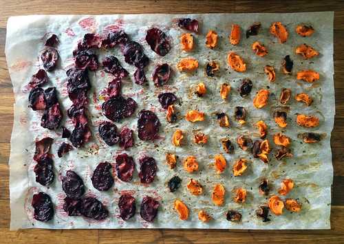 Со свеклой поступить так же, выложить их в один слой на пекарской бумаге и поставить сушиться в духовку. Причем сделать это нужно быстро — вступая в контакт поверхностью продуктов, соль начинает вытягивать из них воду, т.е. все самое вкусное стечет и смоет заправку.